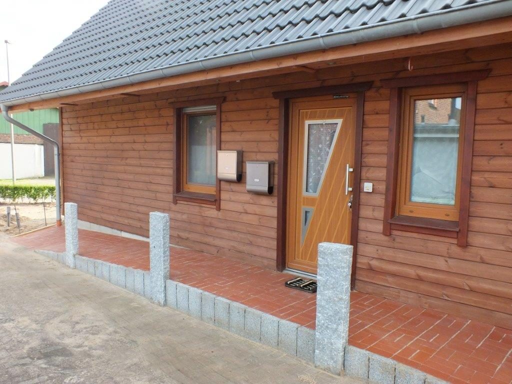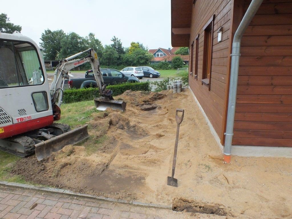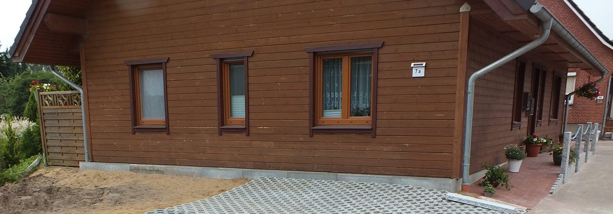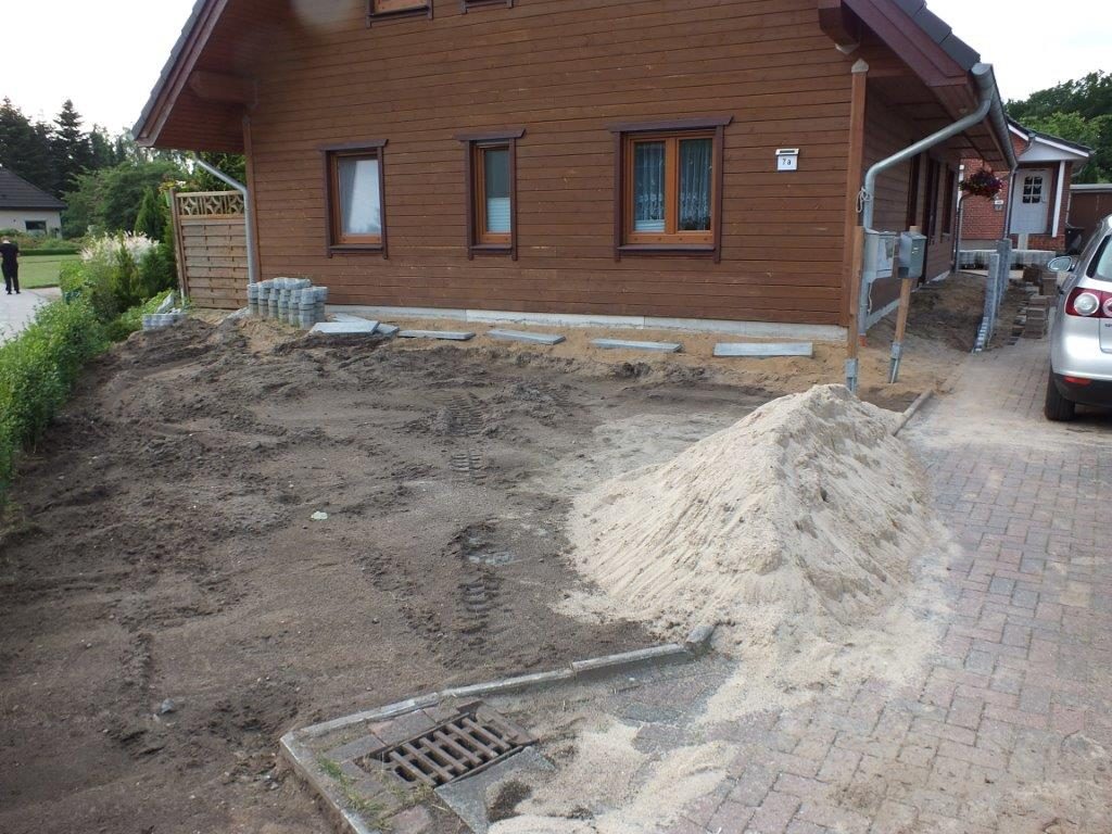 Vor dem Haus entstehen ebenfalls 2 Parkplätze, welche mit Rasengittersteinen gestaltet werden. Seitlich und dahinter entstehen Beete. Vor dem Haus wird die Kante erneuert und wieder mit Kieselsteinen gefüllt, was verhindern soll, das die Wände auf der Wetterseite bei Regen mit Dreck vollgespritzt werden.