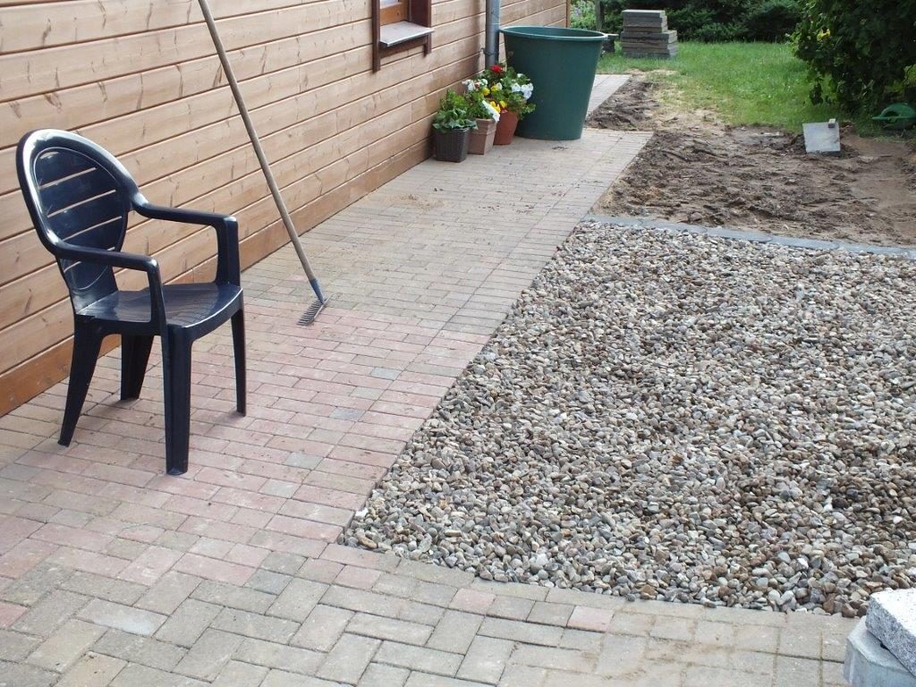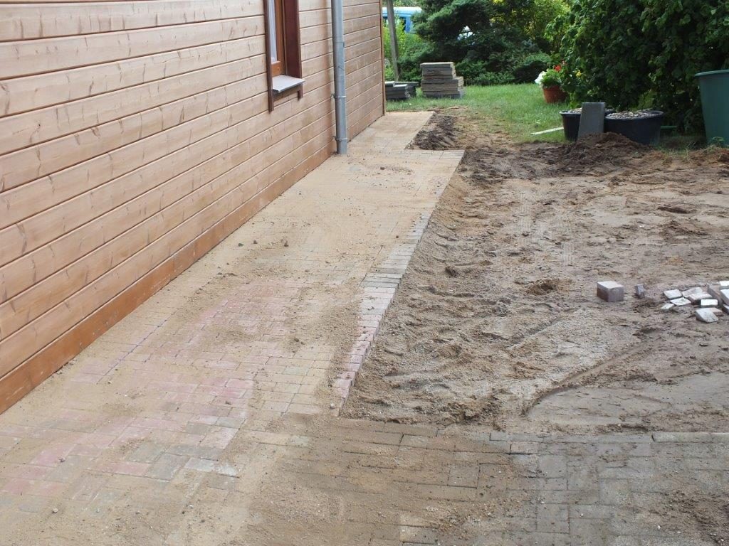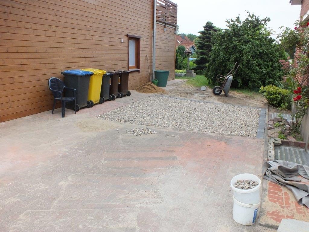Ein 1,2m breiter gepflasterter Weg hinter dem Haus dient künftig als Stellfläche. Die Parkfläche wurde mit einer Kieselfläche verlängert.