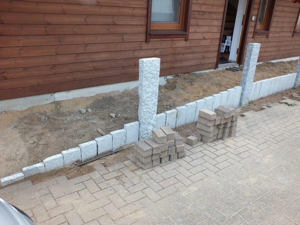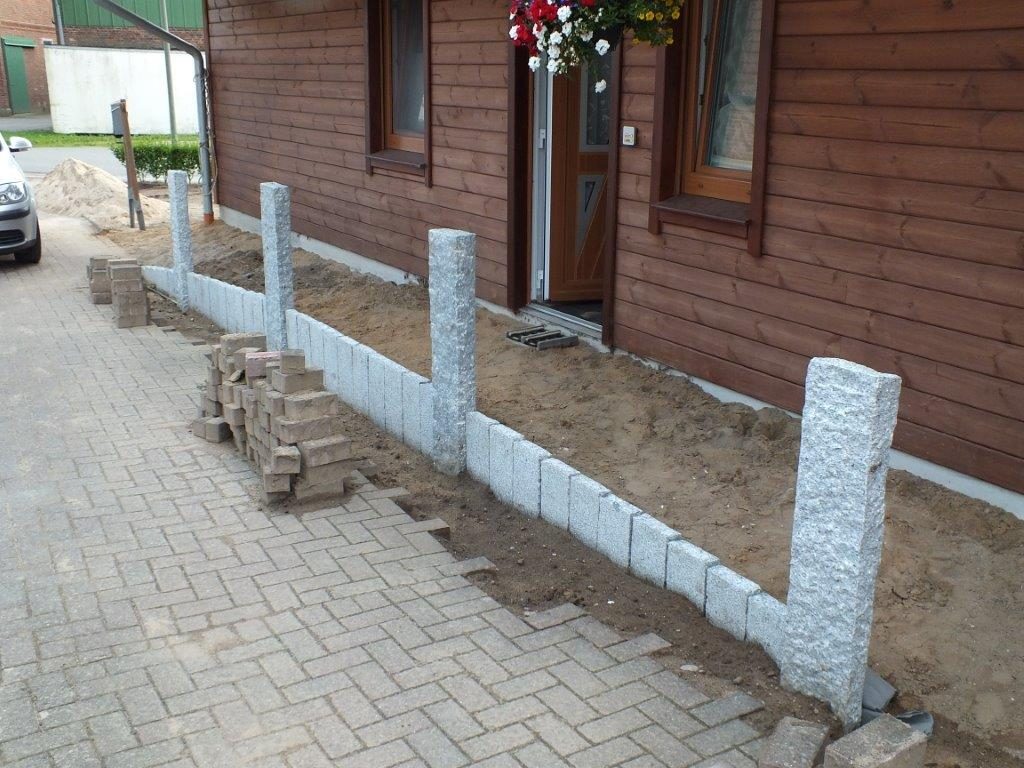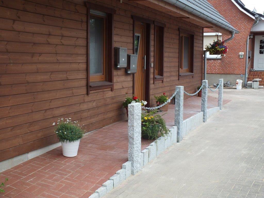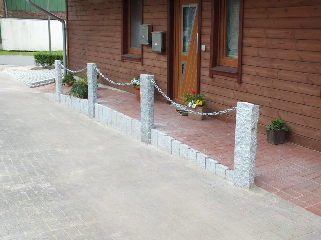 Zwischen die großen Granitstelen kommen verzinkte Ketten, welche vor der Haustür bei Bedarf entfernt werden kann.