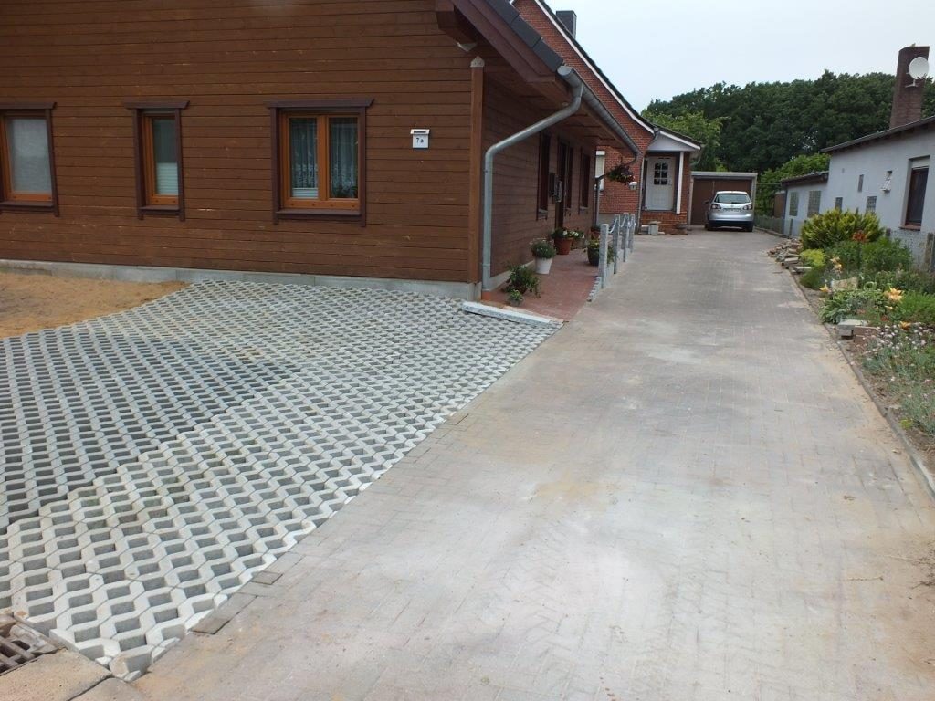 Obwohl sie vom selben Baustoffhändler kommen, weichen die neu hinzugefügten Rasengittersteine im Format ab. Wenn sie später gefüllt sind, wird das aber kaum noch auffallen. Sonst ist in diesem Land auch alles genormt, nur bei Baumaterial kann jeder herstellen, was er will…
