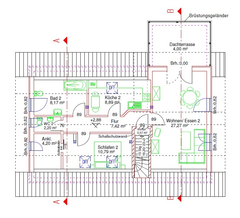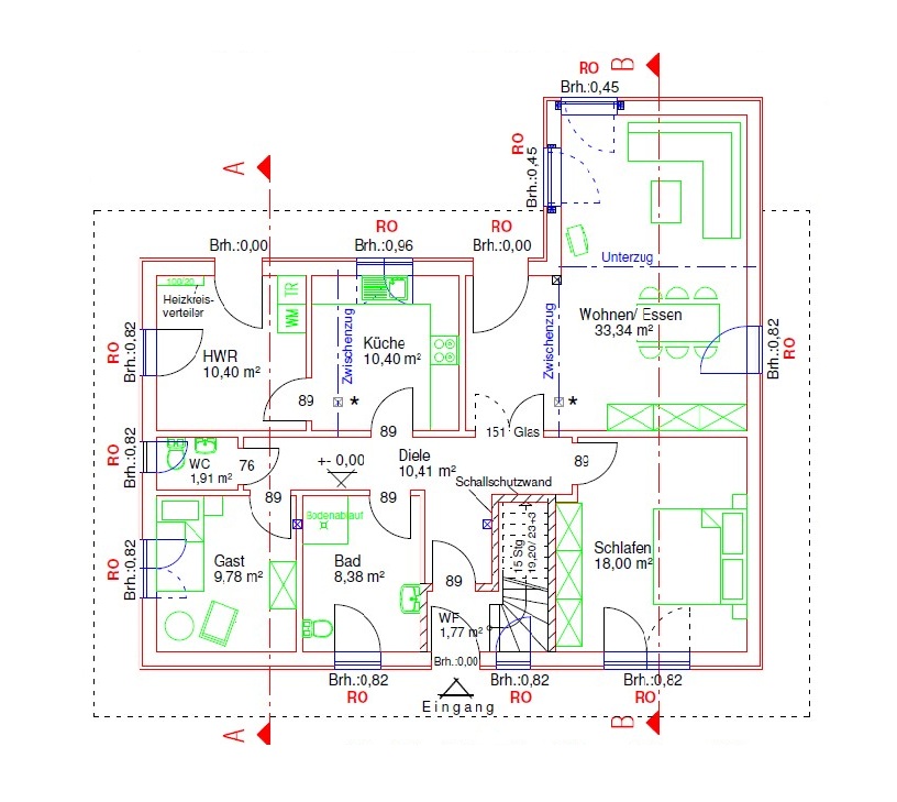 Das Haus: Blockbohlen mit Talisecke (patentierte wetterdichte Eckverbindung); Ums ganze Haus ein 1 Meter breiter Dachüberstand; 3-fachverglaste Kunststofffenster, nach Aussen in Holzoptik foliert; Braas-Doppel-S-Pfannen im Farbton Granit. Das Erdgeschoss hat ca. 105 qm Wohnfläche, verteilt auf komb. Wohn-/Esszimmer, Küche, Schlafzimmer, Gästezimmer, Bad, Gäste-WC und Hauswirtschaftsraum. Das Dachgeschoss hat auch noch wahnsinnige 73 qm Wohnfläche, verteilt auf komb. Wohn-/Esszimmer, Schlafzimmer, Ankleidezimmer, Küche, Bad, Gäste-WC. Als Besonderheit bekommt meine Wohnung eine Dachterrasse. Zudem wird der Dachboden so gestaltet, das man dort jederzeit eine Art Schlafkoje einbauen könnte. Wird sogar einen Heizkörper da oben geben. Auch im Dachgeschoss wird eine Fussbodenheizung eingebaut. Staubfangende und aufwirbelnde Heizkörper sind irgendwie Out.